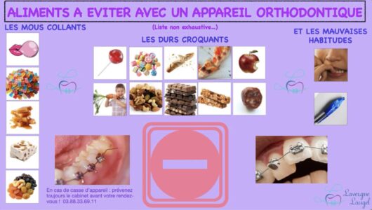 Parce que les bagues sont collées à la surface des dents, il y a désormais des aliments à éviter parce qu’ils ont la capacité de fragiliser ou de décoller les bagues, ce qui risque de compliquer et rallonger le traitement.